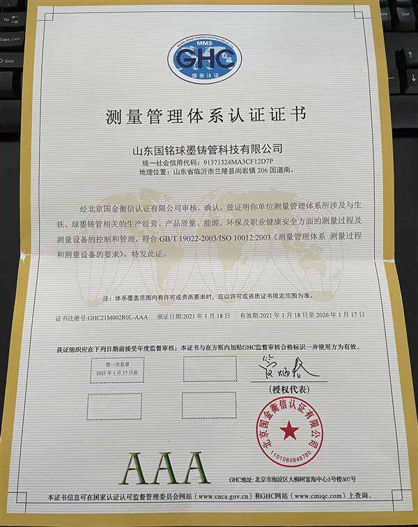 公司堅持以質量為生命,以滿足用戶需求作為自己的追求,依靠雄厚的技術力量和先進的生產、檢測設備,對生鐵、球墨鑄鐵管產品進行全過程控制,產品質量得到全面的保證